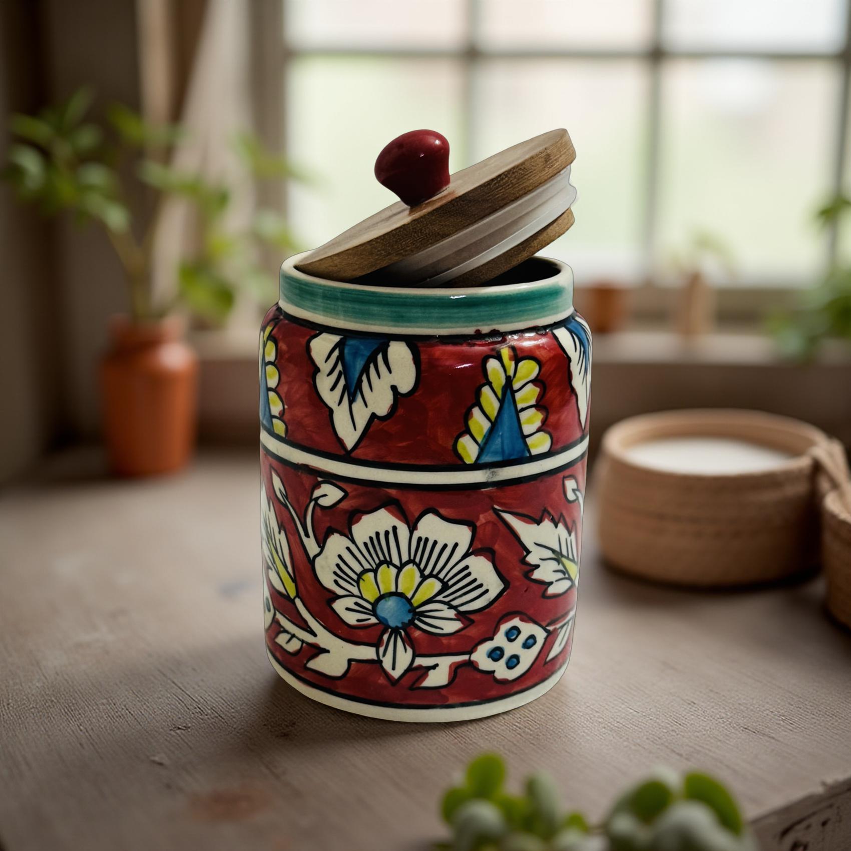 Brighten your kitchen with these handpainted red ceramic jars featuring bold floral motifs and smooth wooden lids – where art meets storage. Can be used as multi utility storage container jar to store day to day knick knacks.
